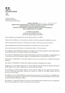 Actualité Arrêté n° BSI-2025-296-01 du 23/10/2025 – règlementant temporairement, la vente, le transport, l’utilisation d’artifices de divertissement, d’articles pyrotechniques et interdisant la distribution, l’achat et la vente à emporter de carburants dans le département du Haut-Rhin En savoir plus