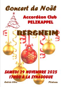 Actualité Concert de Noël de l’accordéon club Pelzkappel samedi 29 novembre à 17h à la Synagogue Concert de Noël samedi 29 novembre à 17h à la Synagogue, entrée libre, plateau. En savoir plus