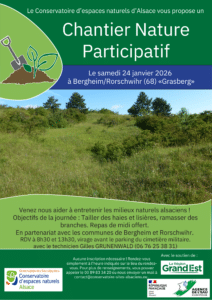 Venez aider le CENA à entretenir les milieux naturels alsaciens, en partenariat avec les communes de Bergheim et Rorschwihr. Objectifs de la journée : Tailler des haies et lisières, ramasser des branches. Repas de midi offert RDV à 8h30 et 14h, virage avant le parking du cimetière militaire avec le technicien Gilles Grunenwald. Pour plus […]