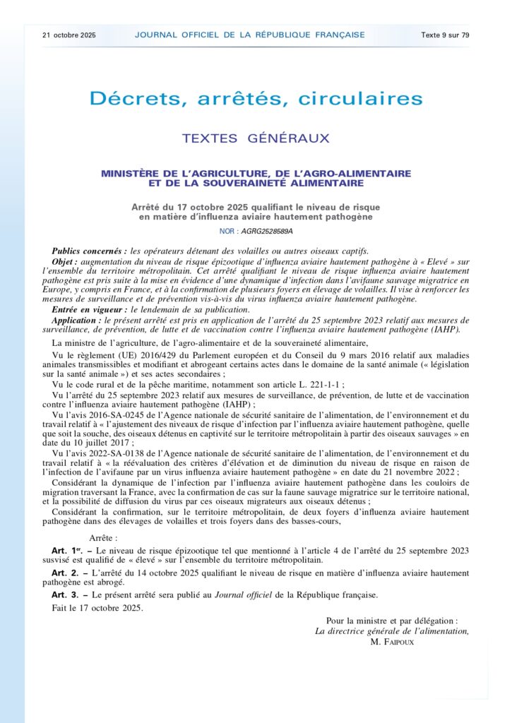 Arrêté du 17 octobre 2025 qualifiant le niveau de risque en matière d’influenza aviaire hautement pathogène
