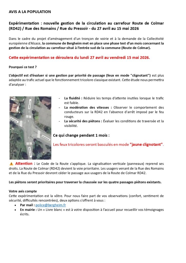 Nouvelle gestion de la circulation au carrefour Route de Colmar (RD42) / Rue des Romains / Rue du Pressoir – du 27 avril au 15 mai 2026