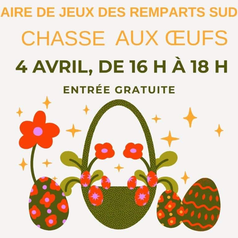 Venez participer à la chasse aux oeufs organisée samedi 4 avril de 16h à 18h, à l’aire de jeux des remparts sud.