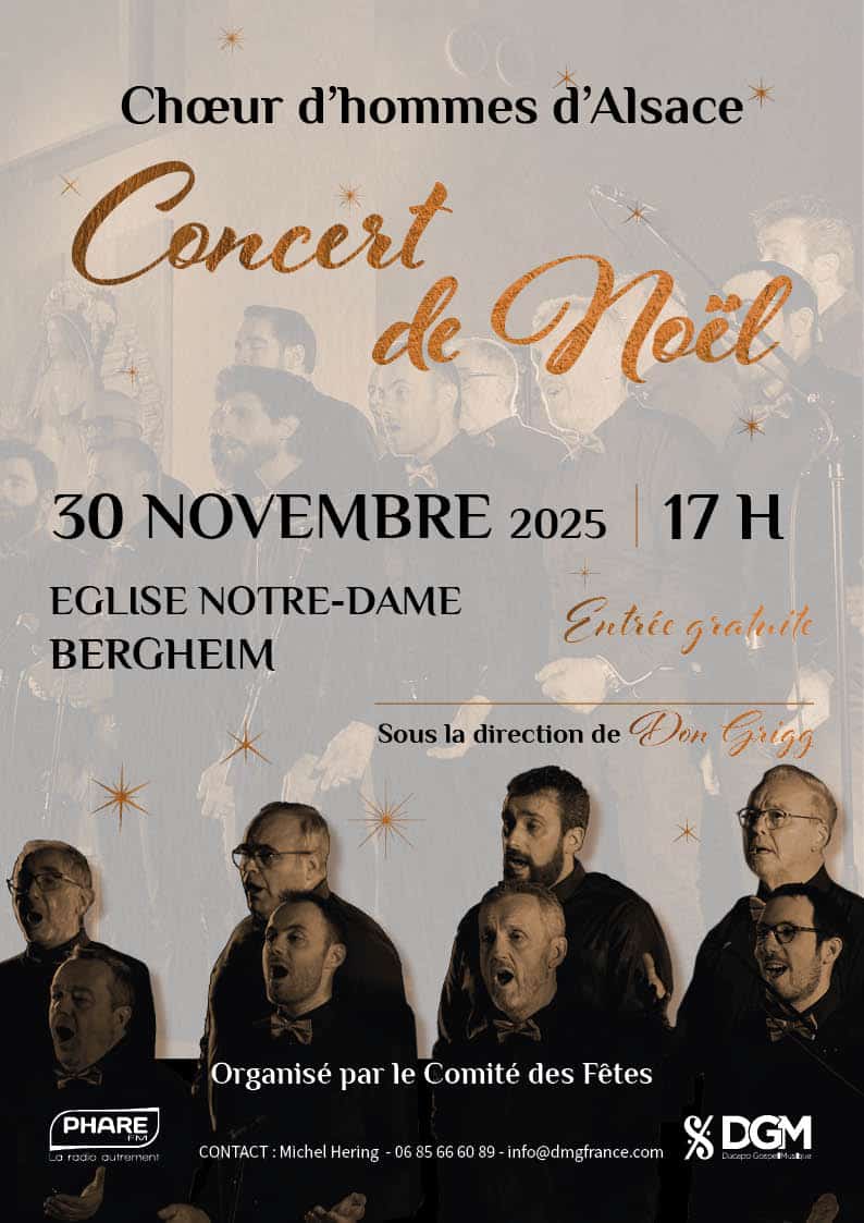 Concert du Choeur d’Hommes d’Alsace le 30 novembre à 17h en l’église de Bergheim. Entrée gratuite.