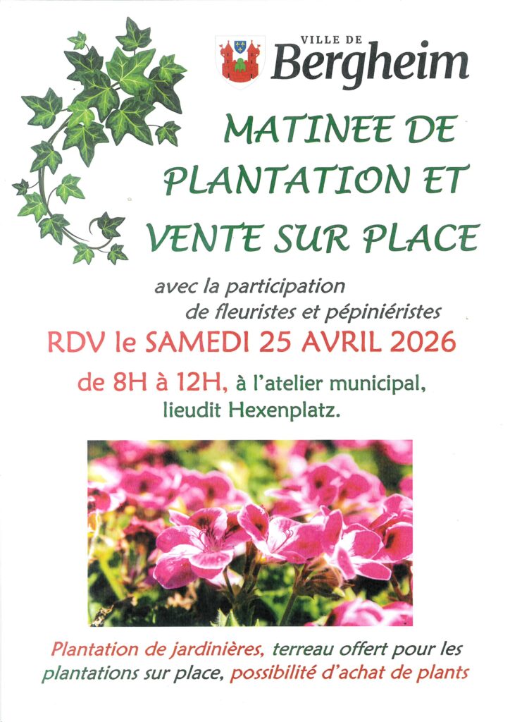 RDV samedi 25 avril 2026 de 8h à 12h à l’atelier municipal. Plantation de jardinières, terreau offert pour les plantations sur place, possibilité d’achat de plants sur place.