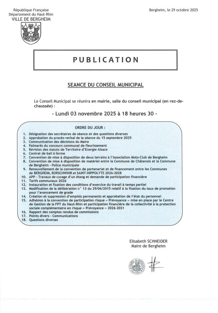 Le Conseil Municipal se réunira en séance ordinaire le 03 novembre à 18h30.