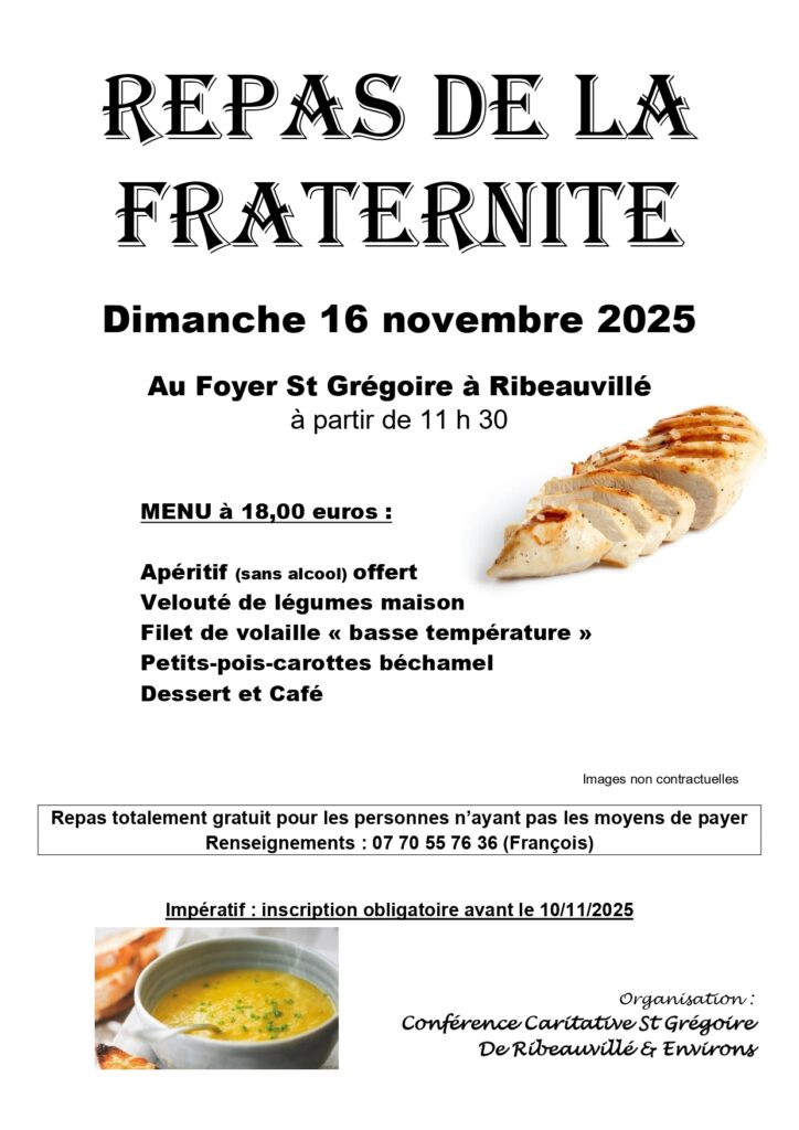 La Conférence Caritative St Grégoire de Ribeauvillé et Environs organise son traditionnel repas de la Fraternité dimanche 16 novembre au Foyer St Grégoire à Ribeauvillé à partir de 11h30. Voir ci-dessous.