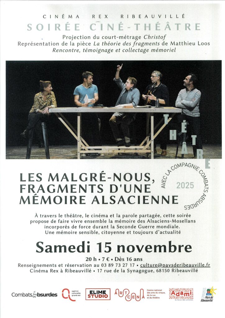 A travers le théâtre, le cinéma et la parole partagée, cette soirée propose de faire vivre ensemble la mémoire des alsaciens-mosellans incorporés de force durant la Seconde Guerre mondiale. Une mémoire sensible, citoyenne et toujours d’actualité. Voir ci-dessous l’affiche.